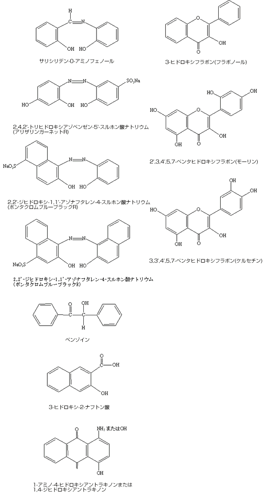 無機化合物では,溶液の場合ウラン,タリウムの化合物以外はそれ自身蛍光を示さないので,通常有機の蛍光試薬は(fluorescence reagent)を作用させて,蛍光性金属錯体を生成させます。蛍光試薬は,一般に2つまたはそれ以上の芳香環を含み,0またはNを含む不飽和結合をもっているものが多くあります。試薬自身には蛍光性がないことが望ましく,純度がよいものを用いる必要があります。また水,溶媒その他の試薬も精製したものを用います。蛍光試薬との反応操作を行う際には,最適条件を正しく守り,pH,溶媒,温度などの影響に注意しなければなりません。表3・1に蛍光試薬の例を示しました。
