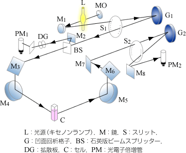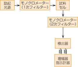 光源は,普通,低圧または高圧水銀ランプが用いられ,前者では254nm,後者では365,405,436nmに強い輝線を出す。また,1次フィルターは不必要な波長の励起光,特に測定する蛍光の波長に近い光を除くのが目的であり,2次フィルターは励起光の反射や散乱,ラマン散乱光などを遮断します。励起光,蛍光ともフィルターを用いたもの(フィルター式)を蛍光光度計,蛍光側だけにモノクロメーターを用いたものを蛍光分光光度計といいます。また,キセノンランプ(200〜700nm,100〜500W)を連続光輝に用い,励起光,蛍光を2つのモノクロメーター(主として回折格子)でそれぞれ分光する方式のものは分光蛍光光度計と呼んでおり,スペクトル測定や,精密な測定に適しています。