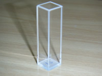 | 測定セルは普通,石英製で四面とも透明な角型セルまたは試験管型セルが用いられ(右写真),特殊なものとして光滑のエネルギー分布などを測定するための三角型セルもあります。ペーパーや薄層クロマトグラフ法によって分離した成分スポットの蛍光を定量的に測る装置,蛍光寿命やりん光,偏光度を測る装置もあります。図3・3に分光蛍光光度計の光学系の例を示しました。 |