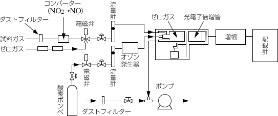 2の含量として測定し,両者の差から求めます。図3・5に計測器(ケミルミ計ともいう)の原理図を示した。大気用は0.005〜数ppmの測定に適し一定時間ごとにNO,NO (含量-NO)の値を交互に記録し,また積算して1時間の平均値(1時間値)を示すようになっています。応答時間は10〜数10秒なので瞬間値を得ることができ,共存成分の影響も小さいですが、目盛校正のための濃度既知の標準ガスと,定量成分を含まないゼロガスとを必要とします。この他,オゾンの測定にも使われています(反応試薬エチレン,発光物質ホルムアルデヒド)。