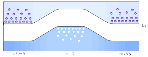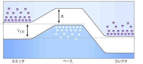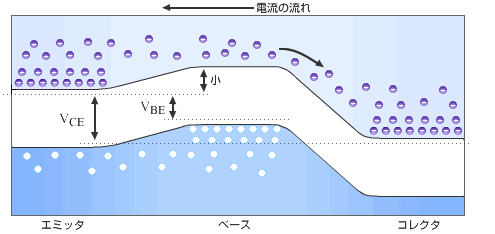 すなわちコレクタ-エミッタ間の電流をベース-エミッタ間の微小電流で制御できる。ベース-エミッタ間の電流は微小は微少で良いためトランジスタは増幅作用がある。物理実験の検出器で微少な信号を取り扱うときにはこの増幅作用を利用している。また携帯電話、テレビ、ラジオ等電波を受信するものは微弱な電波をトランジスタで増幅している。 コレクタ-エミッタ間の電流をベース-エミッタ間の電流で制御できるということはスイッチとして利用できることを意味する。コレクタ-エミッタ間の電流をスイッチとしてベース-エミッタ間の電流をON, OFFできるからである。この作用を利用して論理回路が組まれる。パソコンなどの計算機にはトランジスタのスイッチ作用を利用して回路が組まれている。 トランジスタの動作の原理は図1-11-2に示したようにベース-エミッタ間の電圧を変えればポテンシャル障壁の高さを変えられることにある。ベース-エミッタ間のポテンシャルを変化させることによってコレクタ-エミッタ間に流れる電子の数を制御している。