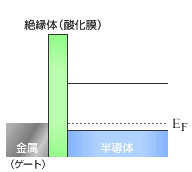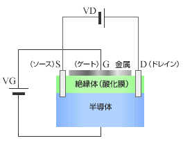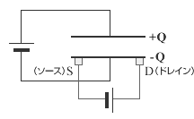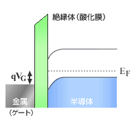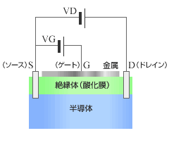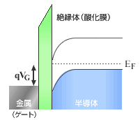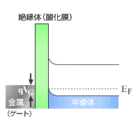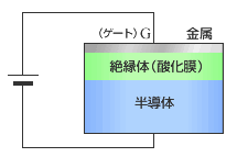 現在、微細加工の容易さから集積回路にはMOS型のトランジスタが多用されている。このトランジスタは今まで説明したようにpn接合を基本としたものではない。MOS型のトランジスタの基本は電荷の蓄積である。図2-12-1aのようにコンデンサーに電圧を印加すると電荷が蓄積される。図2-12-1bのように蓄積された層に2つの電極(ソースSとドレインD)を設け、この間に電圧を印加すれば蓄積された電荷がキャリアとなって電流が流れる。電荷の量はコンデンサーへの印加電圧で制御できるのでSとDの間に流れる電流を制御できる。実際のMOS半導体は図2-12-2の様な構造でコンデンサーを形成する。金属(ゲート)と半導体の間に電圧を印加すればバンドは図2-12-3の様に曲がる。半導体はp型を用いているが界面近傍ではフェルミレベルと伝導帯が近づきむしろn型の性質を界面近傍に電子が集まる。図2-12-4aのように電極S,Dを設けてやればゲートへの印加電圧でS,D間の電流をコントロールすることができる。実際には図2-12-4bのようにSを共通にして電圧がかけられる。