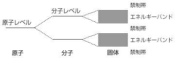 物質とは何か?それを問うことは物理学のひとつの王道である。物質は金属、半導体、絶縁体にわけることが出来る。そしてそれらは当然原子から構成されている。それでは原子はどういう構造をしているか?原子は電子と陽子から構成され、電子が陽子の周りを回っている。しかしそれは地球が太陽の周りを回るようなイメージとは若干異なる。量子力学的には電子は粒子であるとともに波としての性質をもつ。ここがポイントである。地球が太陽の周りを回る場合には軌道半径、地球の運動エネルギーはいかなる値も取りうる。しかし電子は波であるために定在波が立つような条件以外では波は減衰してしまう。定在波が立つ条件は弦の長さが半波長の整数倍の時のみである。波長はエネルギーに相当するため電子の取りうるエネルギーはとびとびになる。この「とびとび」ということが量子力学の「量子」に相当する。この様な観点から量子力学は波動力学と言われれこともある。 二つの原子が近づいて結合すると(分子になると)電子の波が干渉を起こし2つのエネルギーレベルに分裂する。さらに原子が集合して固体になるとエネルギーレベルは幅を持ちバンドとなる。(図2−2−1)