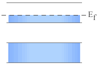 このバンドはもともと原子最外殻にある電子(価電子)のエネルギー準位で構成されているためバンドの中には電子が存在することができる。一方バンドの外では電子は存在できない。これを禁制帯という。電子はエネルギーの低いバンドからつまっていくがこの電子が(絶対零度で)存在することの出来る最大のエネルギーをフェルミエネルギー(EF)またはフェルミレベルという。(フェルミレベルに関しては統計力学で学習する。)フェルミエネルギーがバンド内にあるときには電子は自由に動くことが出来、金属となる。(図2−2−2a)