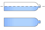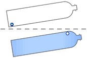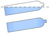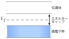 一方フェルミエネルギーが禁制帯内にあるときには禁制帯には電子が存在できないためにフェルミエネルギー以下のバンドは電子で満たされ、フェルミエネルギーよりも上のバンドは空となる。(図2−2−2b)この様な状態では金属とは違って電子は自由に動けず、半導体、または絶縁体となる。フェルミレベルよりも低いエネルギーをもつバンドは原子の価電子で構成されているので価電子帯といいフェルミレベルよりも高いエネルギーにあるバンドは電気伝導に寄与するので伝導帯という。価電子帯と伝導帯の間の禁制帯幅をエネルギーギャップまたはバンドギャップという。もしエネルギーギャップを越えて伝導帯に電子が励起されれば伝導帯の電子は自由に動くことが出来、電気伝導に寄与する。電子は光エネルギーまたは熱エネルギーで励起することが出来る。(図2−2−2c)半導体は絶対零度では伝導電子が存在せず電気伝導はないが常温では熱励起によって伝導電子が存在し電気伝導性を示す。 話を単純化するために電子を水にたとえてみよう。フェルミエネルギーというのはそれ以下には電子が存在することが出来るエネルギーであるから水の最上部すなわち水面に相当する。図2−2−3〜図2−2−5のように二つのペットボトル(ボトル)を用意しこれらをエネルギーバンドにたとえる。ボトルの中には水を入れることが出来るが2つのペットボトルの間には水を入れることが出来ない。従ってここは禁制帯に相当する。(図2−2−3a) 上または下のペットボトルの半分ぐらいまで水を入れる。(フェルミエネルギーがバンドの中にある状態)このペットボトルも右側を持ち上げると水は左に移動する。(電圧をかけ右側のポテンシャルをあげれば電子は左に移動し電流が流れる。電圧は電子に対するポテンシャルであるから電圧を印加する事は水に対して高さを変えることに相当する)(図2−2−3b)2つのペットボトルの間に水面を持って来ようとした場合には2つのペットボトルの間には水を入れることが出来ないため下のペットボトルにいっぱいに水がつまる。(電子は価電子体に存在し伝導体に電子はいない)(図2−2−4a)この状態で右側を持ち上げても水は左に移動しない。(電子は動かず電流は流れない)(図2−2−4b)これが絶縁体または絶対零度での半導体である。次ぎに下のペットボトルの水を一滴取り出し上のペットボトルに持ち上げた状態を考える。(電子を価電子体から伝導帯に励起する。)(図2−2−5a)この状態で右側を持ち上げると下のペットボトルの空気は右側に移動し上のペットボトルの水滴は左に移動する。すなわち伝導帯の電子は左に動き電気伝導が生じる。(図2−2−5b)金属の場合(図2−2−3b)に比べて移動する水(伝導電子)の量が少ないために半導体は電気伝導度は小さい。
