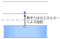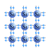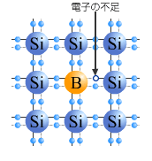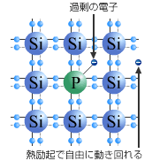このように半導体は絶対零度では伝導体に電子が存在しないために電気伝導はない。(図2−2−2)室温でも熱的に励起される電子の数は少なく抵抗率は非常に大きい。半導体に不純物を添加(ドープ)すると電気電導率を高めることができる。このドーピングは半導体においては非常に重要でこれをシリコンを例にして説明する。Siは4配位であるために平面図で表現すれば図2−2−6aのように結合している。これに不純物として5価のP(リン)やAs(砒素)を不純物として添加すると図2−2−6bの様に一つの電子が余る。