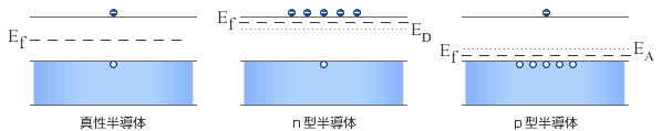 この電子は室温程度で容易に不純物からはなれ結晶中を動き回る。これが半導体の伝導電子となる。このような不純物をドナーと言い、不純物によって電子を与えた半導体をn型半導体と呼ぶ。逆に不純物として3価のB(硼素)やAl(アルミニウム)を加えたときには電子が足りなくなり電子の穴が生じる。(図2−2−6c)このタイプの不純物はアクセプターという。この電子の穴を正孔またはホールと呼びこのような半導体をp型半導体と呼ぶ。電子とホールを前述の水の動きにたとえれば上のペットボトルの水滴が電子に、下のペットボトルの空気が正孔に相当する。従ってドープされた半導体では電気電導率が高まる。不純物のドープされていない純粋な半導体を真性半導体という。真性半導体、n型半導体、p型半導体のフェルミレベルをバンド図に書くと図2−2−7となる。室温程度で電子が容易に不純物からはなれるということがフェルミレベルが伝導帯又は価電子帯に近いことに相当する。