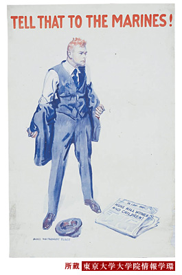 プロパガンダ・ポスターでは迷う男に対して、おまえは真の男か/女か、敵か/味方かと迫るだけではない。カナダの募兵のポスターでは、背景のない空間にいる男に「あなたは例外ではない、さあ入隊しよう」と誘いかけている【#525】(http://archives.iii.u-tokyo.ac.jp/search/detailresult/id/200)。そして、迷う彼がいよいよ一歩を踏み出すのは、「弱い女・子どもを守るため」である。 ![]() 次に、「海兵隊に伝えよう」(#205)という募兵ポスターを見てみよう。男の足元には大きな見出しのついた新聞が落ちている。記事のタイトルは「ドイツの野郎が女子どもを殺している」。つまり、男は、敵が女・子どもを殺す新聞記事を見るや否や義憤に駆られて、新聞と帽子を下に叩きつけたのである。画面に描かれたのは背広の上着を脱ぎ捨て、喧嘩のポーズを取った男が兵士になる瞬間である。 このようにここで挙げた例は、アメリカ、カナダ、イギリスと国も状況も異なるにも関わらず、募兵のための視覚の文法は驚くほど似通っていることに気づくだろう。いずれも日常生活にみる「男らしさ」「女らしさ」のジェンダー規範を忠実に守っており、その規範から外れることへの恐怖を巧みに突いたものであることが指摘できる。