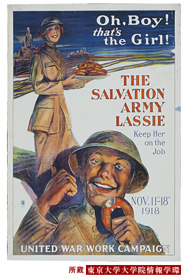 戦場に関わる女性は、女性看護師だけではない。若い男性兵士から「おやまあ、女の子だぜ!(Oh, Boy! That’s the Girl!)」【#309】と指差されているのは、にこやかにドーナツを配る救世軍の女性である。若い男性兵士に活力を与えるのは、かじりかけのドーナツではなく、山盛りのドーナツの皿を運ぶ若い女性の方である。この図像と「彼女が仕事を続けられるようにしてやってくれ」と呼びかける文字テクストに矛盾はない。 ![]()