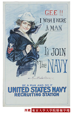 アメリカのポスターに関する上記の特徴はこれまでにも論じられてきたが、さらに加えて、セクシーな若い女性がたびたび登場していることが指摘できる。たとえば、水兵の制服を着た若い女性が「ああ!男に生まれてたら、ゼッタイ海軍!」【#159】と悔しがる募兵ポスターは、カレンダーにも使われ当時大きな評判を呼んだ1枚である。同様に誘惑的なポーズで男を誘う「あなたが欲しい、海軍に」【#158】(http://archives.iii.u-tokyo.ac.jp/search/detailresult/id/94)にも、セクシーな女と戦意高揚の結びつきを見ることができる。