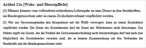 4-5-1 番組制作街道 ドイツ連邦国基本法 ナチス・ヒトラーといった歴史的背景を連想させる、ドイツ連邦共和国。明治時代の頃から日本の欧化政策により、選んだ国の一つであるドイツ連邦共和国。勤勉で質素で工業系が得意であるという点も、ドイツと日本は似ていると言われている点も。さらに大戦の敗戦国となり、その後脅威の復興を成し遂げた点でも、共通していると言われ続けている。しかし今、根低に「兵役制度」という大きな違いが存在する。2004年4月9日・23日に放映された在阪テレビ局の番組枠1で私が制作した作品『ボクには殺せない 〜ドイツ・兵役制度と生きる男たち〜』2では、その「ドイツの兵役制度」について取り上げている。ここではドキュメンタリーのテーマである「兵役制度」について歴史的背景を交えながら述べたい。 ![]() 憲法I-1 ドイツ連邦共和国基本法3