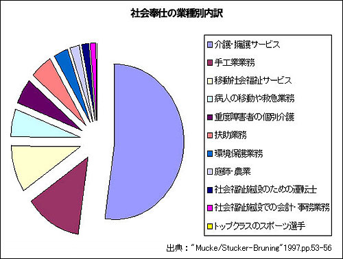 上記は「ドイツ連邦共和国基本法」すなわち、日本でいう憲法に当たるものの一部である。ドイツの憲法の第12a条第一項には「男子に対しては18歳から軍隊、連邦国境警備隊員または民間防衛軍における役務に従事する義務を課すことができる」4 と記されている。すなわちドイツ国籍を持ち18歳以上の男性に、9ヶ月間「兵役義務」が課せられるという内容である。ドイツの中等教育は、生徒の能力・適正に応じてハウプトシューレ5、実科学校(レアルシューレ)6、ギムナジウム7の3つのうち、各々が将来描く夢に応じた学校を選択することができる。この中等教育終了後、大学進学、または就職の前に、ドイツの軍隊へ入隊し軍事訓練を行わなければならない。この制度は男性にのみ課せられるもので、女性には課せられない。ドイツ軍隊、正式にはドイツ連邦国軍と呼ばれ、大きく分けて陸軍・空軍・海軍に分けられる。軍隊入隊後は強制的に各部署へ配属される。CIAの統計8によると、ドイツ連邦国軍の世界的な位置づけは国防費・軍事輸出入費等トータルのランキングで第五位となっている。32万3000人の兵力を持っており、そのうち兵役義務者は13万人。全体の約40%を占め、残りは職務軍人から成立している。 先ほど兵役義務について明記されている憲法を挙げたが、それにはまだ続きがある。ドイツ憲法の第12a条第二項には「良心上の理由から武器をもってする戦争役務への従事を忌避する者には、代替役務への従事を義務として課すことができる」という記述である。簡単に言うならば、兵役に就いて軍事訓練を行うことが良心すなわち、宗教や信条にそぐわない時は兵役義務を拒否することができる。その代わりに兵役よりも長い10ヶ月間、兵役に替わる社会奉仕活動を行わなければならない。兵役を拒否した若者は、ドイツ語で“ 表I-1は、兵役拒否者達が社会奉仕活動を行っている業種別内訳である。圧倒的半数以上が「介護・養護サービス」、すなわち老人ホーム等の施設で働いていることが伺える。他の活動現場としては、ドイツ赤十字・ユースホステル・消防署・救急車両等々ドイツのありとあらゆる場所で兵役代替役務者の姿を見ることができる。兵役に替わる活動はドイツ国内だけでなく、海外でも行うことができる。その場合には、国内の代替期間よりも長い12ヶ月間行わなければならない。日本をはじめヨーロッパ諸国の福祉現場で働く若者もいる。 ![]() 表I-19