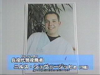今回番組でドイツの兵役制度をテーマとして取り上げた上で、私が最も悩んだ点が「兵役を拒否した人々」をどう扱うかという点である。即述のように、兵役を拒否した人々は「良心的兵役拒否者」とも呼ばれていることから、日本人に観せることを前提とした作品を作った場合、良心的兵役拒否者の良心、イコール反戦を願い、世界平和をも掲げているヒーローのような存在として見られてしまうのではないかという不安があった。ましてや兵役の替わりにボランティア活動まで行っていると言うこととなればなおさらのこと、ドイツで兵役を拒否した若者達は清らか心の持ち主である、という印象を与えかねないという恐れを感じていた。もちろんドイツの青年達の中にも、平和を切に願い、兵役拒否をした若者もいる。しかし、実際のドイツでは必ずしもそうではないように思えたのである。それゆえ、ナレーションやテロップまた翻訳には「良心的兵役拒否者」という言葉は一切使用していない。その代わりに「兵役代替役務者」と言う言葉を使用することで、私なりの結論を出した。(次項photoII‐12参照)