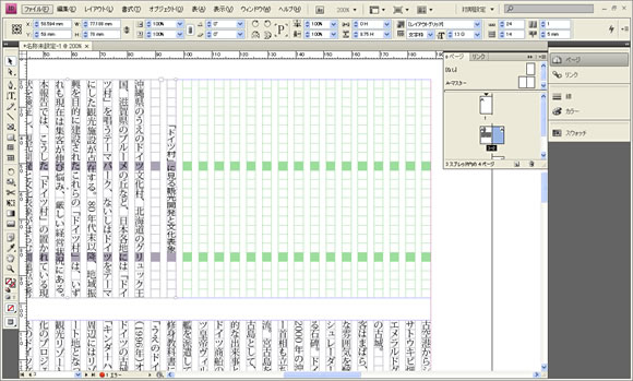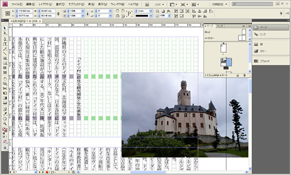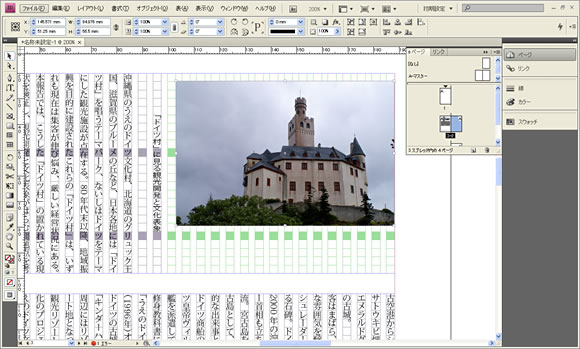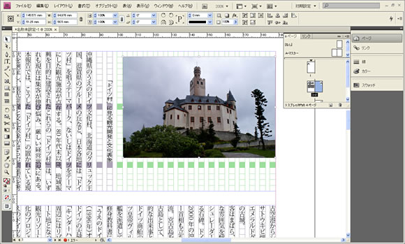 次に、画像を貼付ける方法を説明します。 文章に画像が重ならないようにするには、「ウィンドウ」→「テキストの回り込み」を実行するという方法もありますが、ここではもっと単純な方法をとります。 画像を貼付けるスペースを空けるために、「選択ツール」で文字の流し込まれたテキストフレームを1つ選択し、サイズを縮小します(図23)。空いたスペースに、画像ファイルをドラッグ&ドロップすると、フレームつきの画像が表示されます(図24)。
