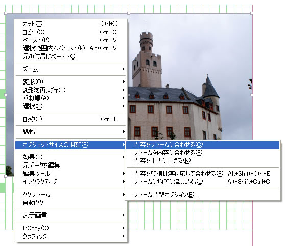 このままだとサイズが合わないので、サイズを調整します。画像フレームを選択し、周囲に表示される小さな四角をドラッグして、サイズを変更します(図25)。縦横比を維持したままサイズを変更したい場合は、Shiftキーを押したまま四角をドラッグします。フレーム全体を移動する場合は、フレーム内のどこかをクリックしたまま移動します。注意したいのは、サイズを変更しても、フレームのサイズしか変更されないという点です。画像のサイズも変更する場合は、画像を右クリックして表示されるメニュー(図26)から、「オブジェクトサイズの調整」→「内容をフレームに合わせる」を実行します(図27)。この点はWordなどのワープロソフトとちがいますので、注意して下さい。
