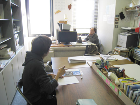 担当ページのどこに何を持ってくるかなどはいっさい決まらないまま、ページ数的に見て扱うであろう三つのゼミを、九つのなかから比較的特色があるのではないかとの理由で選び、各先生方に取材に行くことから始めた。取材にはカメラを持参し、とりあえず@「専門研究」、A「ゼミナールのメンバーが個別に研究していること」、B「今現在興味がある、これから掘り下げて研究してみようと思うこと」、の三つの質問項目だけを用意し、後は取材の話のなかで出てきた、ネタになりそうなことをメモして追加で載せようと思っていた。意気揚々と研究室へ取材に向かったのだが、残念ながらお三方とも不在であった。後日出直して行ってみてもまた不在で、思わぬところで出鼻をくじかれる。これが後にも尾を引くのだが、やはり先生方は忙しいようで、つねに研究室に在室しているわけではなく、在室しておられても手が離せないため、また後日ということもあった。昼休みや授業後など、比較的在室しておられそうな時間帯を狙ってアポを取りに行くが、教授会などでまた出直しということもあったりした。