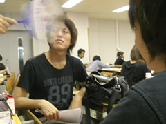 最初に頭の中で思い描いていたデザインは、自宅生・下宿生それぞれのある一日の時間割を載せ、その時間割の内容に沿った写真とコメントを付けるというものでした。しかし、実際にその構図で作ってみると、自分が思っていたよりもわかりにくく、また単調なものになってしまいました。そこで今度は、見る人にとってわかりやすいようにし、またデザインも単調なものにならないようにしました。その結果できたのが、ページ全体を使い時間の流れを円で表現したものです。このデザインは自宅生のほうに使い、下宿生では、別の直線的なデザインにしました。自宅生・下宿生共に、写真は円形に加工し、その円の近くに「登校」、「午前授業」、「昼休み」、「昼食」、「午後授業」、「下校」、「放課後」、「バイト」とタイトルをつけ、その内容と合った写真を載せました。