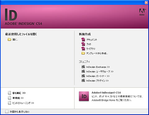 まずはじめに、InDesignを起動して基本的なレイアウトを作成します。InDesignを起動すると、スタートアップスクリーン(図1)が表示されるので、「新規作成」の項目から「ドキュメント」を選択します。スタートアップスクリーンが表示されない場合は、「ファイル」→「新規」→「ドキュメント」を実行します。