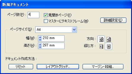 ドキュメントの基本設定をきめるパレット(図2)が表示されます。ここではページ数「4」、ページサイズを「A4」に設定します。そのほかの設定は図のようにします。ページ数や縦書き・横書き、綴じ方も指定できます。
