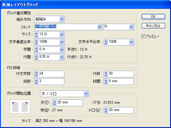設定が終わったら、「レイアウトグリッド」のボタンをクリックします。レイアウトグリッドの設定は図3のようにします。ここではフォントサイズを「13Q」、段数「3」、段間「8 mm」に設定します。その他の設定も図の通りであることを確認して下さい。「OK」のボタンをクリックすると、レイアウトグリッドを含むレイアウト用のドキュメント(図4)が作成されます。これでドキュメントの作成は終わりです。