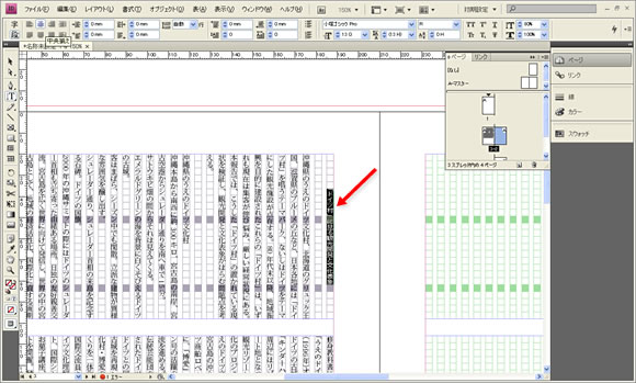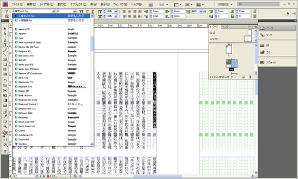 次に、流し込んだ文章の文字設定を行います。 「縦組み文字ツール」を選択するか、テキストフレーム内をダブルクリックして、文字が入力できる状態にします。テキストの一部または全体を選択し、画面上方にある文字コントロールパネルで、書体やサイズを設定します。ここでは書体を「小塚ゴシックPro B」、サイズを「13Q」にします(図18)。文字コントロールパネルでは、書体やサイズだけでなく、文字間、行間の調整、文字の縦横拡大なども設定できます(図19)。画面上方の「段」のボタンを押すと表示される段落形式コントロールパネルでは、文章の配置の仕方が設定できます。たとえば、文字揃えを「中央揃え」に設定すると、文字がテキストフレームにたいして中央に揃えられます(図20)。「字」のボタンを押すと、文字コントロールパネルに戻ります。文字の色を変えたい場合は、ツールパレットの「塗りカラー」をダブルクリックし、カラーピッカーのパレットから色を選択します3(図21)。