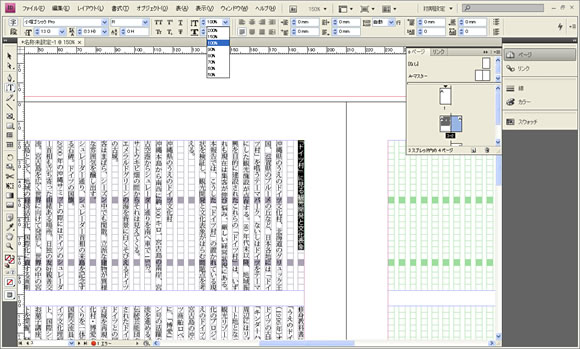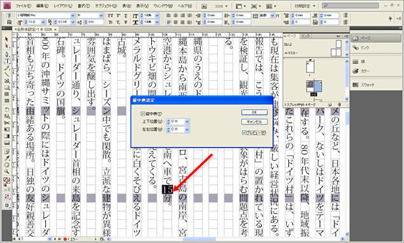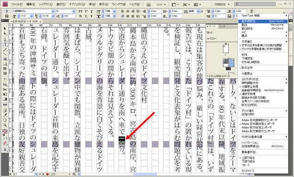 4 縦組みの場合、テキストを全部選択(もしくはスタイルで設定)し、段落パネルのサブメニューから自動縦中横設定を行うことで、1箇所ごとに選択して縦中横をしなくても自動的に設定することもできます。 |